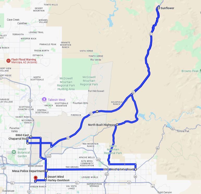 From the Mesa Police Department, we will ride to Mesa Community College where we will meet riders from the other routes. Plan on at least 5 hours total time for this route.